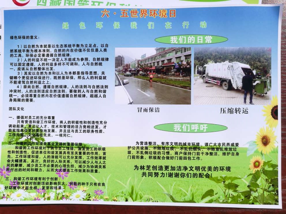 2017年6月5日,在林芝市巴宜區(qū)廈門廣場開展《六五世界環(huán)境日》環(huán)保宣傳活動,——“青山綠水便是金山銀山”,呼吁廣大市民、游客等廣大群眾參與保護雪域高原最后的碧水藍天;此次活動由林芝市環(huán)保局牽頭組織舉辦,參與活動單位:林芝市市政管理局、西藏國策環(huán)??萍脊煞萦邢薰玖种シ止?、林芝市農牧局、林芝市國土資源局、林芝市發(fā)改委、中國華能、巴宜區(qū)環(huán)保局、林芝市商務局、林芝市科技局、林芝市林業(yè)局等單位?;顒蝇F(xiàn)場也聚集市民、游客等參與環(huán)保宣傳和學習環(huán)保知識。