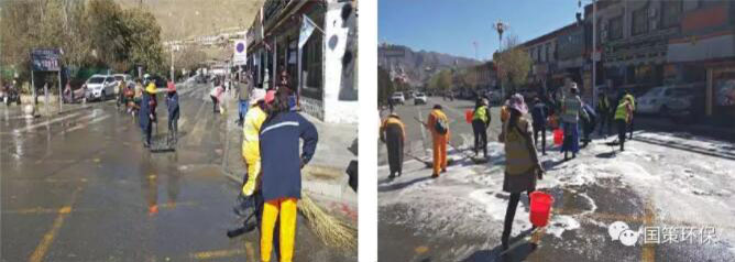 當(dāng)天11:00~17:00,我公司出動大型灑水車2輛、人行道洗地車1輛、環(huán)衛(wèi)工人及管理人員共45人對扎寺廣場和珠峰西路(扎寺廣場至體育路路口)的路面進(jìn)行沖洗,共計出動灑水車8車次,沖洗面積達(dá)20000平方米,耗資15000元。